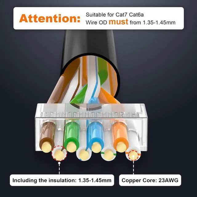 DIY RJ45 CABLE shielded connector terminates shielded twisted pair solid cable for making custom length Ethernet patch cords; Supports CAT6A CAT7 STP/FTP 23 AWG round solid or stranded wire, for wire core OD 1.35 ~ 1.45 mm. The wire OD of cables with the same AWG specifications may vary depending on the manufacturer. Please ensure wire OD MUST meet the requirements. (Flat cable not supported due to difficult installation)