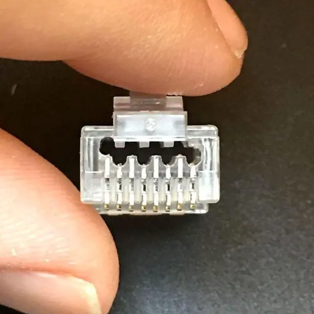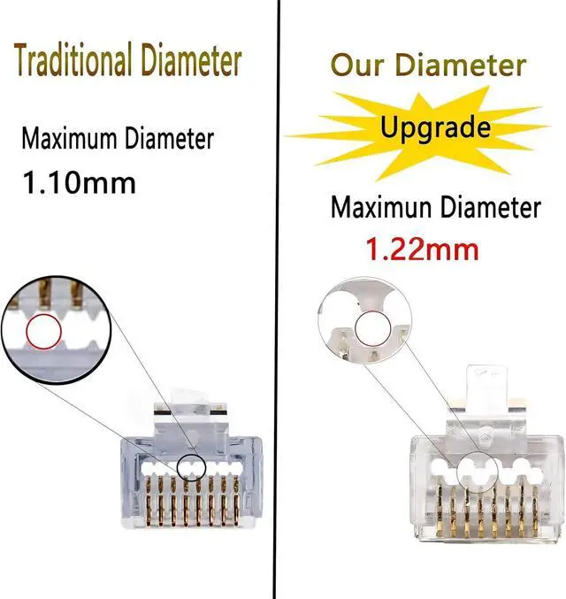 These RJ45 cat6 connectors have staggered jacks, maximum diameter 1.22 mm, supported 24awg and 23awg cable Pass-Thru design allows the wires to pass through the connector so the twists in each pair can be pulled closer to the contacts than conventional plugs.