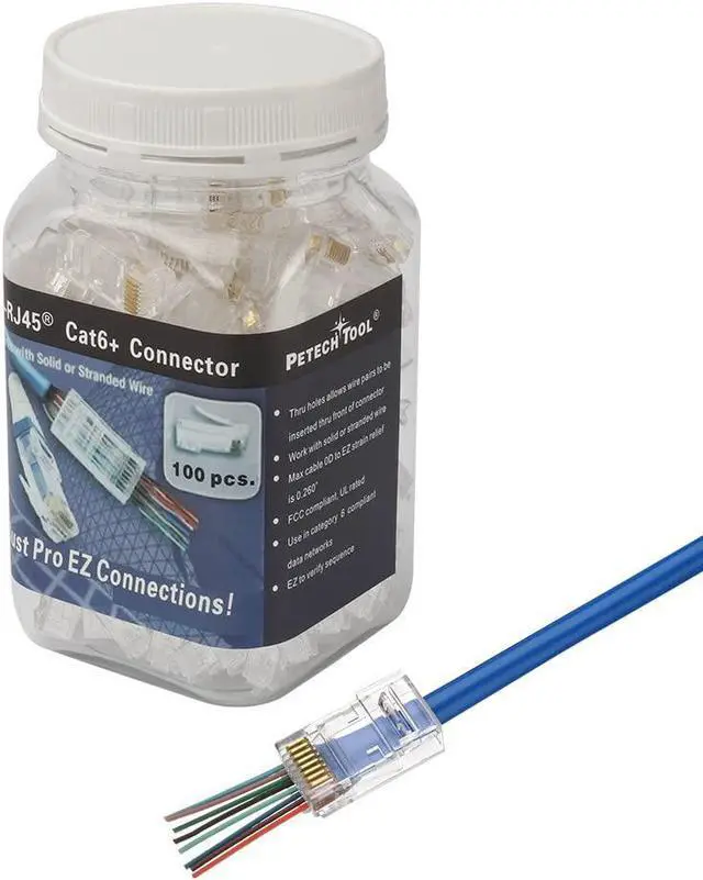 Package List: 100 packs rj45 cat6 cat6a pass thru connectors in a bottle.
