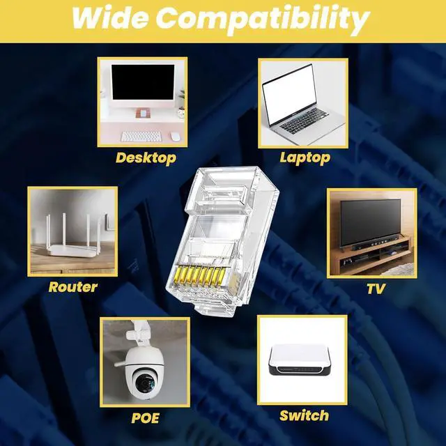 130-PackThe package contains 100pcs Cat6 RJ45 connectors and 30pcs self-adhesive cable clips, plus a yellow wire stripper to make your wiring work easier. RJ45 connectors are compatible with Cat6/5/5e solid or stranded UTP cable (24-26awg).