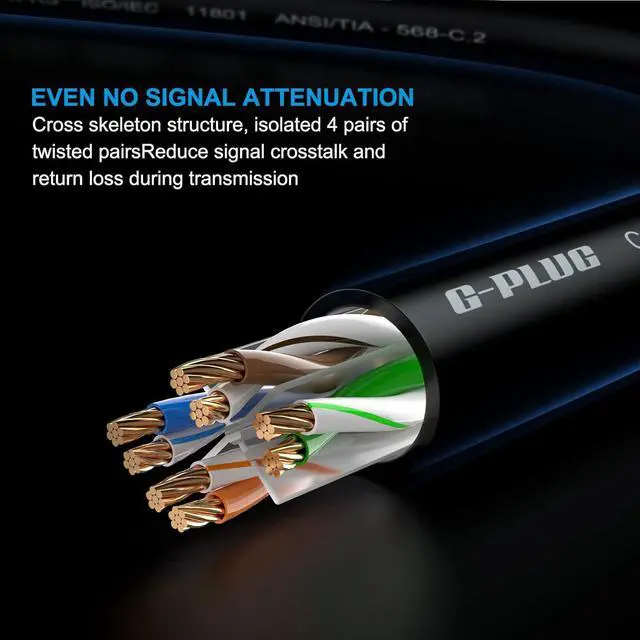 Only the highest quality materials, backed by expert engineering, are used in every G-PLUG ethernet cable cat 6. With superior cross-skeleton structure & 4 isolated pairs, our cat6 patch cables protect against crosstalk & loss for smooth transmission. With speeds of up to 1000mbps, our cat 6 ethernet cables will let you game, work, & stream with lightning speed.