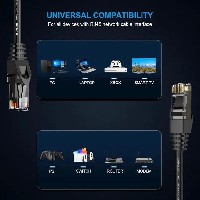 Universal connectivity makes our gaming ethernet cable high speed the perfect cat cable for laptops, routers, modems, computers, printers, network printers, Xbox X/S Series, Xbox One, Xbox 360, PS3, PS4, PS5, network-attached storage devices (NAS), VoIP phones, and DSL cable. From online gaming to office to smart home connectivity, our ethernet patch cable has you covered.