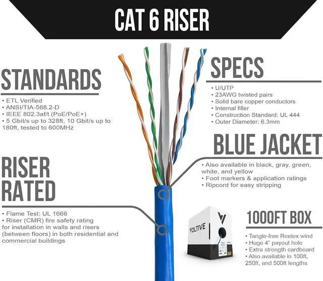 CAT 6 NETWORK CABLE. 23 gauge, 4 pair, solid copper conductors w/ spline, unshielded (UTP). 1, 2.5, and 5 Gigabit speeds up to 328ft, 10 Gigabit up to 180ft. ETL Verified. Tested to 600MHz. PoE, PoE+, & 4PPoE/PoE++.