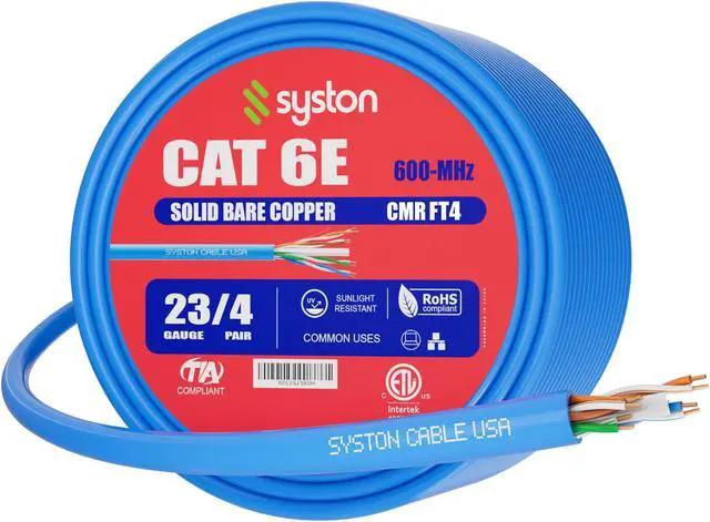 SYSTON CABLE TECHNOLOGY CAT 6E Ethernet Bulk Cable, 600MHz, 23/4pr Solid CU, CMR, Indoor/Outdoor 250 ft. Blue