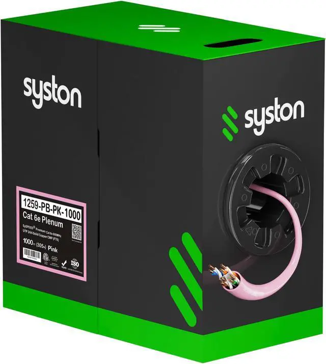SYSTON CABLE TECHNOLOGY CAT 6E Ethernet Bulk Cable, 600MHz, 23/4pr Solid CU, CMP, Indoor/Outdoor 500 ft. White 1000 ft. Pink