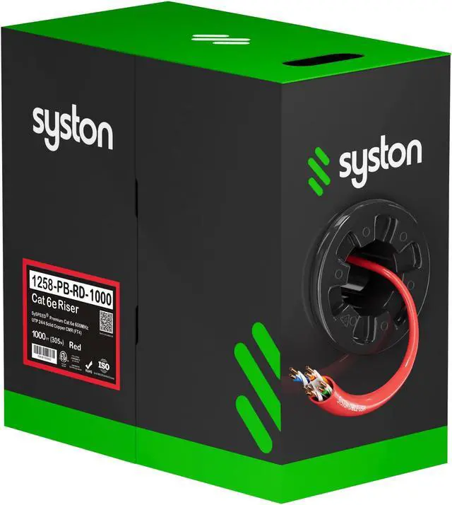 SYSTON CABLE TECHNOLOGY CAT 6E Ethernet Bulk Cable, 600MHz, 23/4pr Solid CU, CMR, Indoor/Outdoor 1000 ft. Black 1000 ft. Red