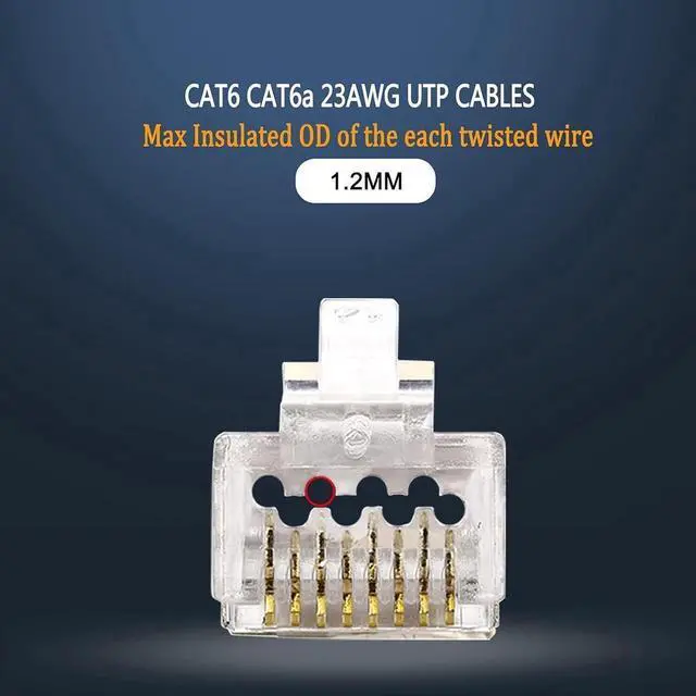 Category 6/6A Compatibility - RJ45 connector is for terminating cat6 cat6a unshielded UTP twisted pair network cable. Supports 23AWG solid and stranded cable; max insulated outside diameter of the wire: 1.20 mm.