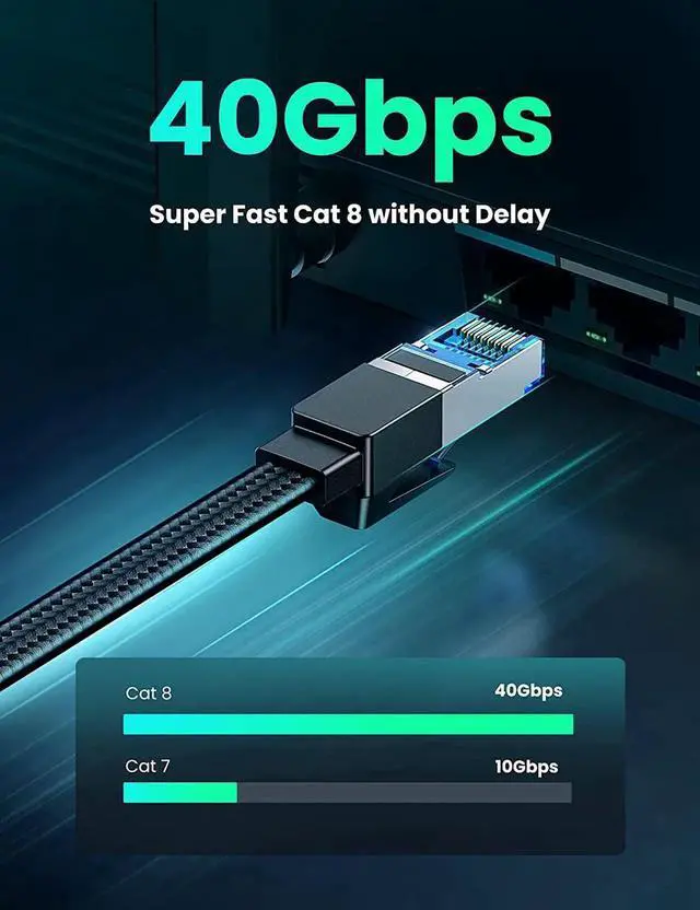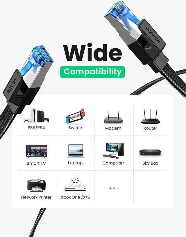 Wide Compatibility: With the RJ45 Connector, UGREEN Gigabit Cat 8 ethernet cable can be perfectly compatible with computers, laptops, modems, routers, PS5, PS4, PS3, X-Box 360, X-Box One, Switch, networking switches, ADSL, network adapters, hubs, and other networking devices. It can also be fully backward compatible with Cat7, Cat6e, Cat6, Cat5e, Cat5.