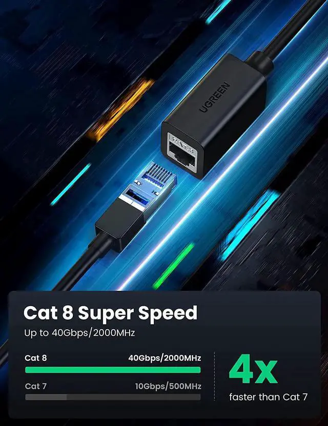 Hyper Speed: UGREEN Cat 8 extension cable supports bandwidth up to 40Gbps/2000MHz, which is 4x faster than CAT 7. Bring your superior experience to enjoy games, HD video, music, upload and download at ultra-high speed.