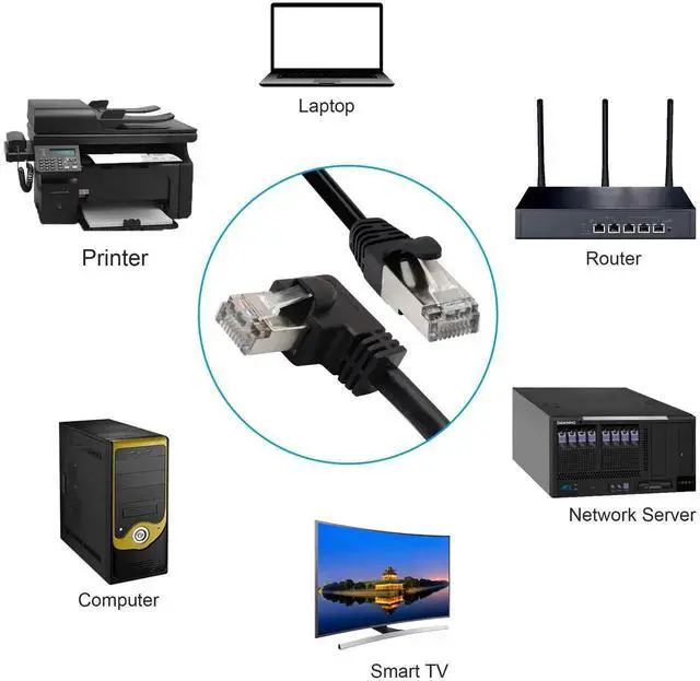 Bend up, down, left, and right Ethernet jumpers provide a solution for connecting in narrow spaces behind furniture or in network closets. Connect the 90-degree upward or downward sloping end to the RJ45 port of the device or the network LAN port; use an angled Ethernet cable instead of excessively bending the straight jumper.