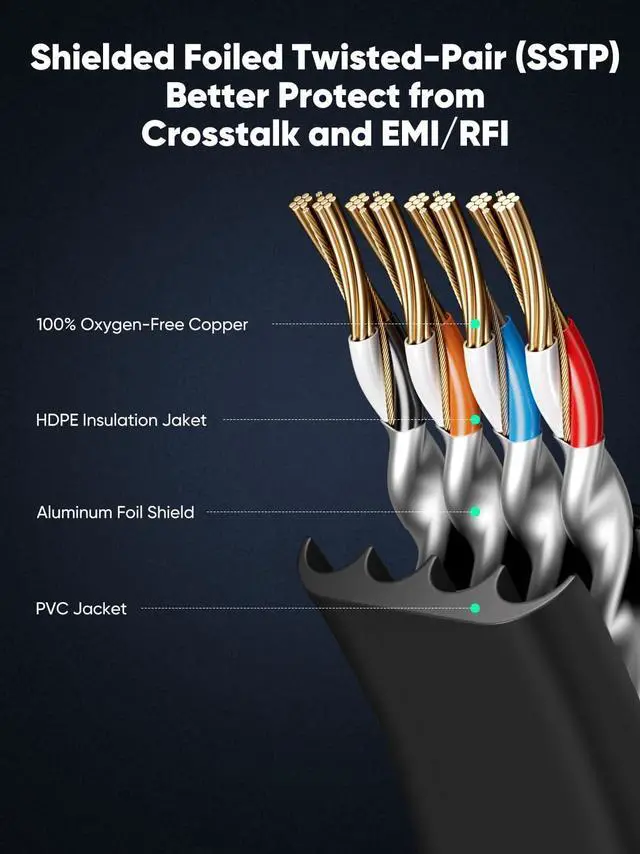 Shielding Interference: Our Cat8 network cables are consisting of 4 shielded twisted pairs (S/FTP) copper wires with 50-micron gold-plated RJ45 connectors on each end