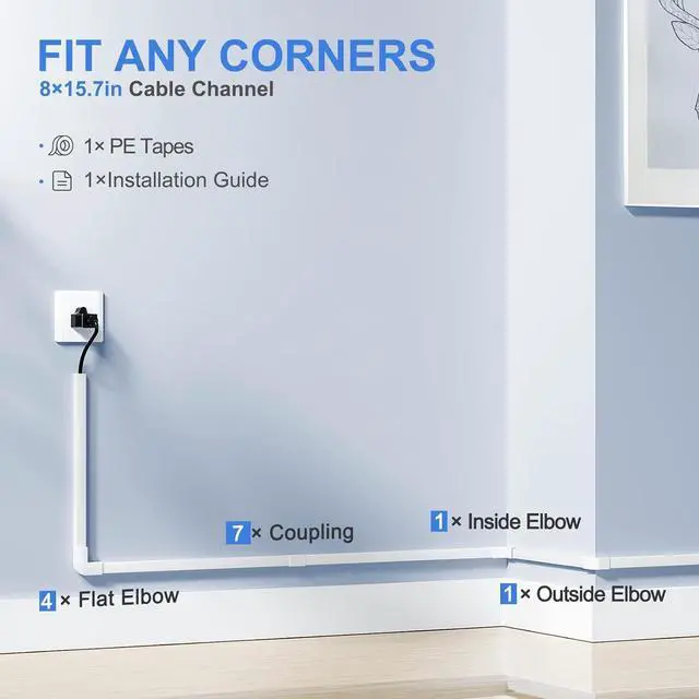 8PCS CABLE MANAGEMENT KIT! Each cable hider wall comes with dimensions of 0.33 " inner height, 0.45 " inner width, and 15.7 " in length, ensuring a total length of 125 inches, for any residential or office project. This cable hider kit includes 8 cable channels, 7 couplings, 4 flat elbows, 1 inside elbow, 1 outside elbow, and 1 roll of clear, reliable mounting tape for maximum cable concealment