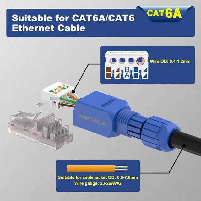 HIGH-SPEED TRANSMISSION - Our tool free RJ45 CAT6A connector is specifically designed for CAT6A/CAT6 Ethernet cable 23-26AWG (with Wire OD of 0.4 - 1.2 mm). Gold-plated contacts ensure speedy and reliable signal transmission, reaching speeds of up to 10Gbps.