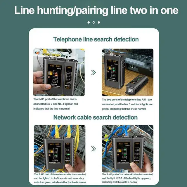 Network Cable TesterThis network cable tester uses testing cables to detect line continuity and error detection points, monitor wiring network engineering, maintain lines, detect short circuits, open circuits, cross-pair faults, and other wiring faults, and easily identify faults to ensure smooth network operation