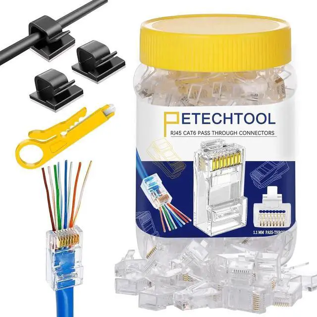 The package contains 100pcs Cat6 RJ45 connectors and 30pcs self-adhesive cable clips, plus a yellow wire stripper to make your wiring work easier. RJ45 connectors are compatible with Cat6/5/5e solid or stranded UTP cable (24-26awg).