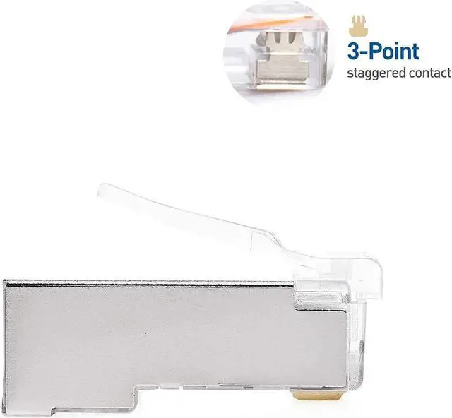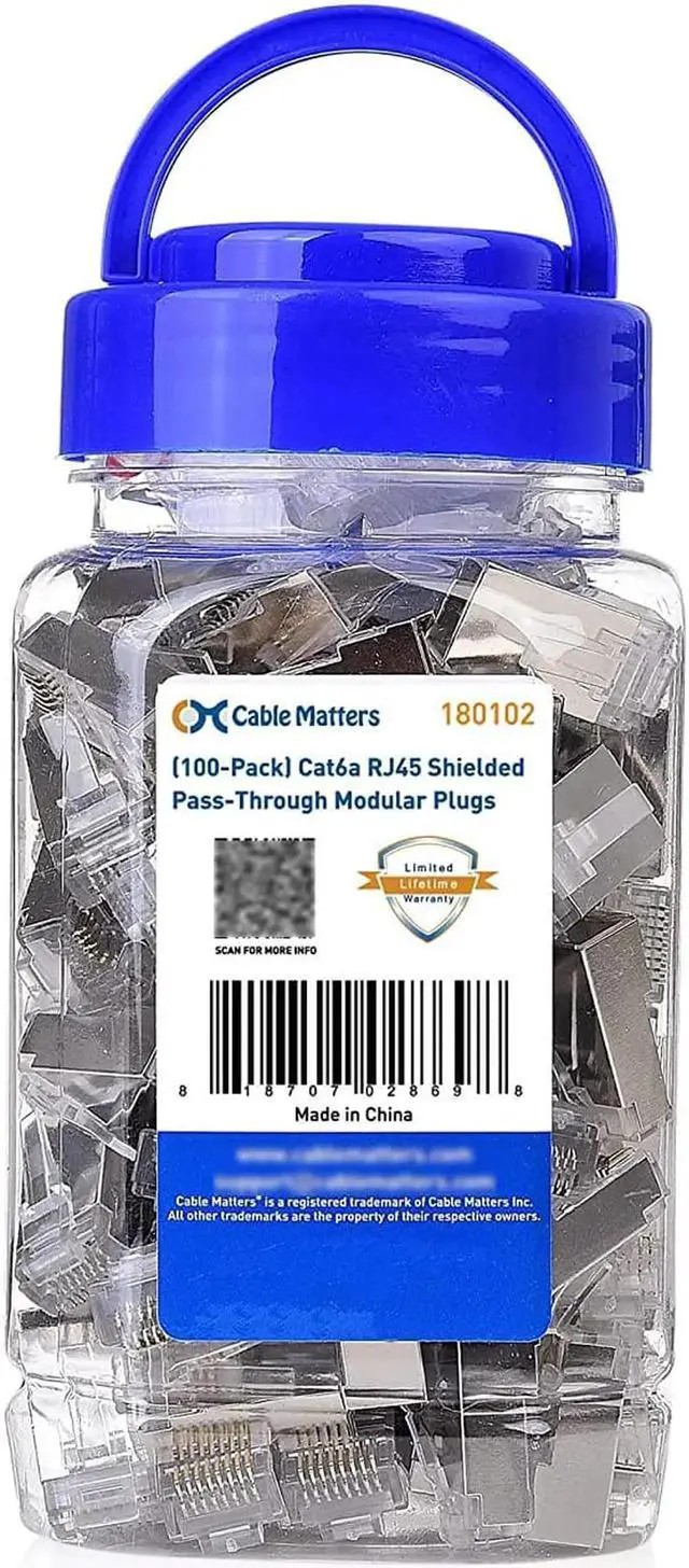 Cost-effective 100-pack of Cat 6A RJ45 modular connectors provides enough connectors for a large project or multiple small jobs; Construct multiple Cat6A patch cables in the perfect length for a router, patch panel, or workstation application with this crimp connector; Cat 6a crimp connectors are also compatible with Cable Matters RJ45 Strain Relief Boots to protect the cable from accidental damage and bolster the integrity of the cable