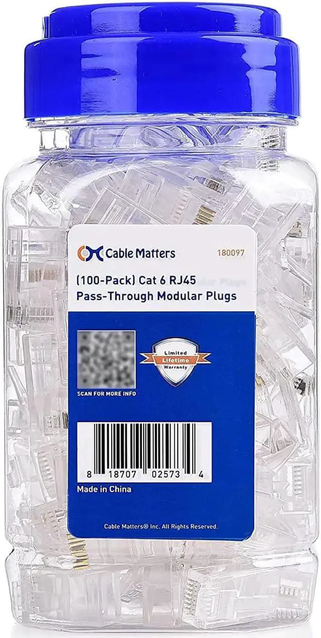 Convenient jar storage container protects and stores the Cat6 RJ45 modular connectors until your next project; Screw-on lid with an integrated handle makes it easy to carry the RJ45 ends along to the job site; A lifetime warranty is included with these RJ45 plugs for peace of mind when purchasing