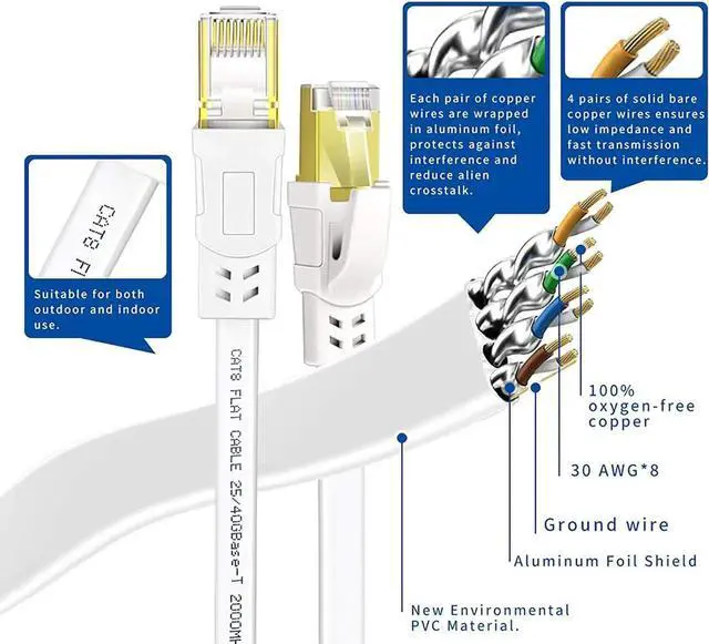 UNIVERSAL COMPATIBILITY CAT 8 cable compatible with CAT7, CAT6, CAT5 cable standards. Works perfectly with networking switch, IP Cam, routers and other device with RJ45 connectors.
