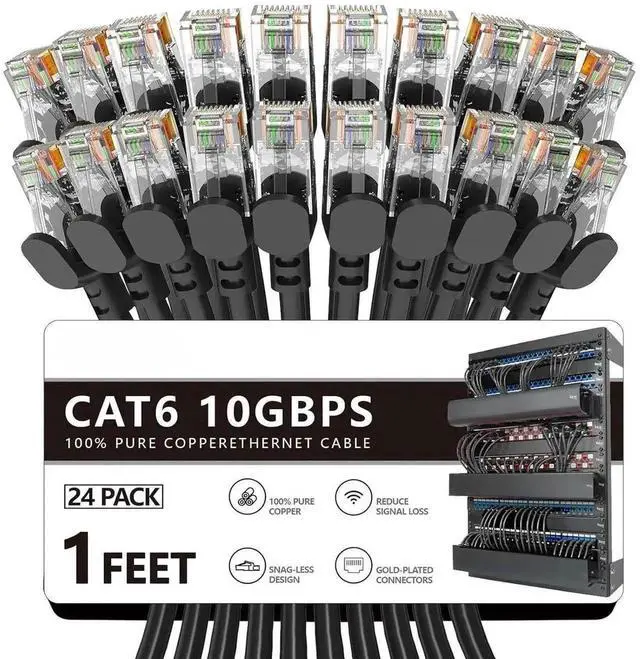 Cat6 Ethernet Cable 3 ft 24Pack, Outdoor&Indoor, 10Gbps Support Cat8/7 Network, 24AWG Pure Copper Patch LAN Cord, Direct Burial Waterproof UV Resistant for Router, Modem, Switch, Server, Black