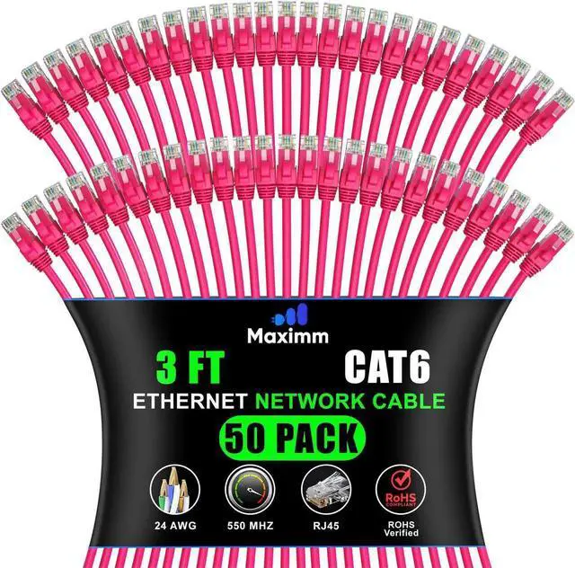 Maximm Cat 6 Ethernet Cable - 3 ft (50-Pack) - High-Speed LAN, Internet, Patch, and Network Cable - UTP, 10Gbps, 550MHz Ethernet Cord - Pink