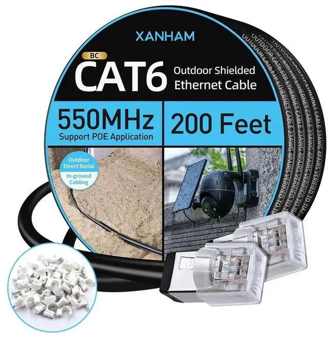 XANHAM Cat6 Shielded Outdoor Ethernet Cable 200 Feet Waterproof and UV Resistant Direct Burial Jacket 23AWG Solid Copper Cat 6 FTP Network Cable, for POE and Internet Cabling Application