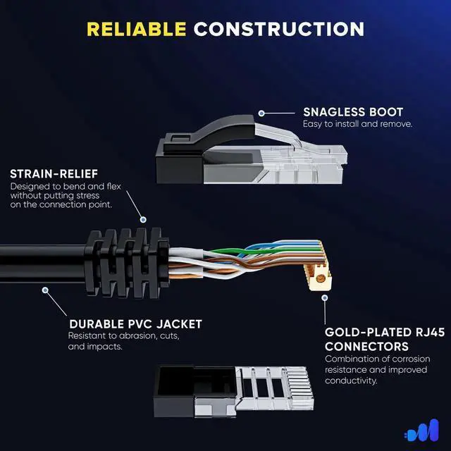 • UTP (Unshielded Twisted Pair) 4 pairs strand with separator for reduced crosstalk, molded snagless rubber boot and strain relief