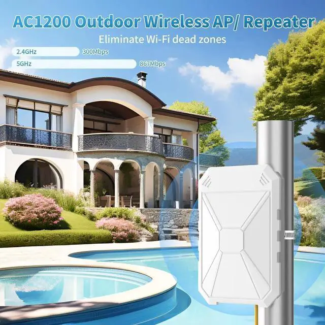 AC1200 Outdoor WiFi Extender, 5GHz / 2.4GH z Outdoor WiFi Extender Signal Booster, IP67 Weatherproof, Passive PoE, Repeater/AP/Router Mode, Extend WiFi for Outdoor Camera, Patio, Garage, Farm