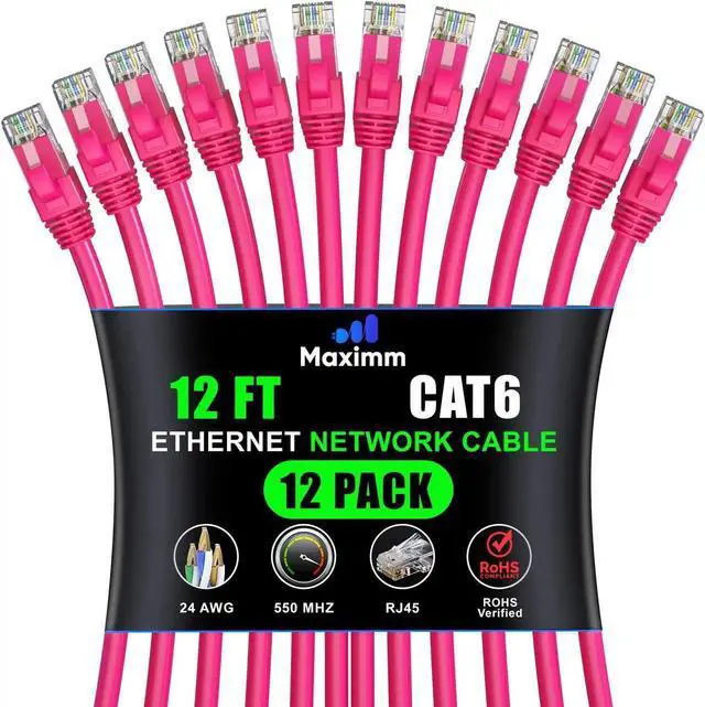 Maximm Cat 6 Ethernet Cable - 12 ft (12-Pack), High-Speed LAN, Internet, Patch, and Network Cable - UTP, 10Gbps, 550MHz Ethernet Cord - Pink