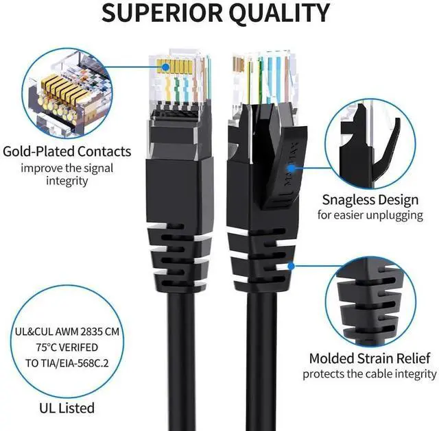 Cat 6 Performance: TIA/EIA-568C.2 compliant and UL listed, conductors are applied 24 AWG stranded copper wire provides up to Cat6 10-Gigabit Ethernet, backward compatible with 10Base-T, 100base-tx(fast Ethernet) and 1000Base-T (Gigabit Ethernet) for 8P8C cat5e and Cat5 cable.