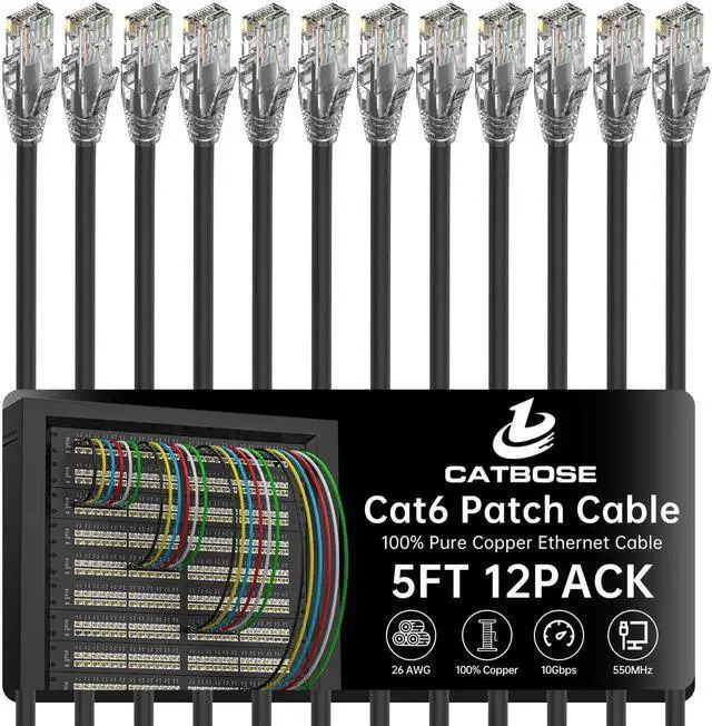5 Feet Cat6 Patch Cables (12 Pack), Solid Pure Copper Patch Cord, Cat 6 Ethernet Cable, UTP Network, High Speed RJ45 Internet Cables, Compatible for Router, Switche, PC, Server, PS4/5, Xbox - Black