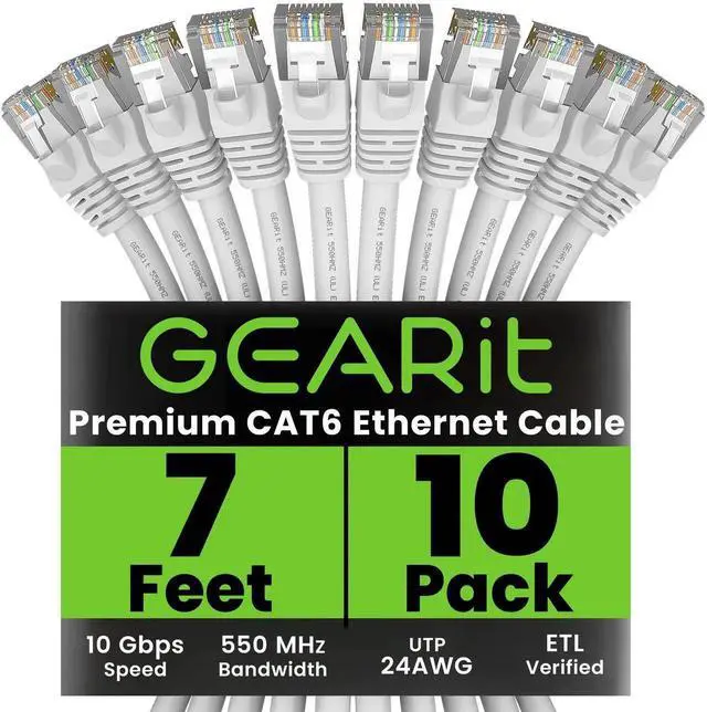 GEARit Cat 6 Ethernet Cable (10-Pack 7 Feet) Cat6 Network Patch, 10Gbps, RJ45, Snagless Cord, Gold-Plated Connectors, Internet for PC, TV, Tablet, Router, Printer, Servers, IT Data Center - White