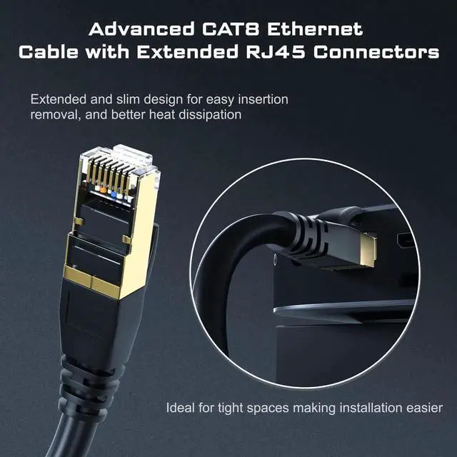 • RJ45 Connectors & Wide Compatibility: Cat8 Ethernet cable with shielded RJ45 connectors at both ends; works seamlessly with switches, printers, Netgear, TP-Link, laptops, IP cameras, routers, Nintendo Switch, modems, PS3/4/5, Xbox, patch panels, servers, hubs, smart TVs and other RJ45 devices; also compatible with Cat7, Cat6, Cat5e, and Cat5 cables