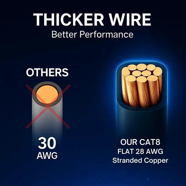 Enhance your internet setup with this high-performance Cat 8 flat Ethernet cable, engineered to provide fast and dependable wired connectivity for all your high-demand online tasks. With support for 2000 MHz bandwidth and blazing 40 Gbps data speeds, it ensures seamless 4K/8K streaming, competitive gaming, cloud-based work, and rapid large-file transferswithout lag or slowdowns.