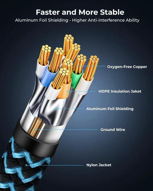 Shielding Interference: The Cat 8 network cable is composed of 4 pairs of shielded twisted bare copper wires that resist external interference. The 50 micron RJ45 connector provides uninterrupted connectivity and less signal loss