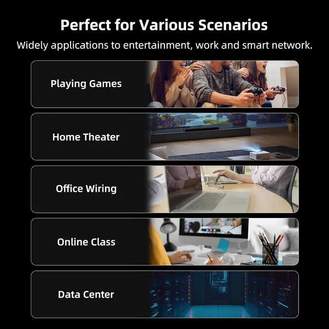 Universal Connectivity: Compatible with all devices with Ethernet ports, including computers, laptops, routers, switches, hubs, game consoles, printers, etc. It is suitable for a variety of scenarios such as home entertainment, office network, and smart home system to improve the overall network experience.