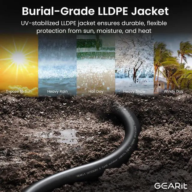 GEARit Outdoor Ethernet Cable - This direct burial Cat6 cable combines ruggedness, blazing speed and impressive value to create the perfect Ethernet networking solution for your outdoor router, backyard office, permanent or temporary outdoor installation, or anywhere you need a reliable network connection that can stand up to weather and harsh conditions.