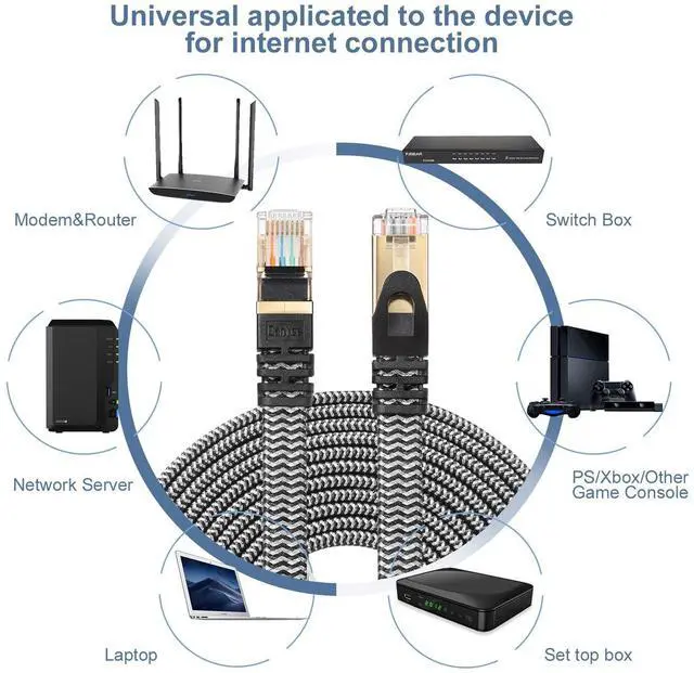 High Compatibility15ft flat cat8 ethernet cable constructed with the rj45 connector makes it perfects for servers, TV, TV Box, laptop, PC, printer, networking switch, routers, ADSL, adapters, hubs, modems, PS3, PS4, x-box, Patch panels and other high performance networking applications.