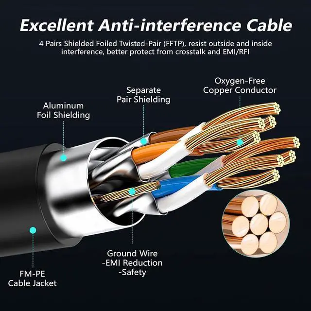 Dual Shielding for Enhanced Protection: Cat8 patch cable features dual shielding technology (F/FTP) that combines overall foil and individually foil-shielded pairs. This advanced design effectively blocks EMI/RFI line noise, minimizing data loss and hardware damage while optimizing equipment performance. It' s ideal for noisy environments where reliability is paramount.