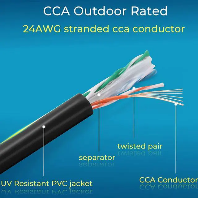 Universal Connectivitycat6 ethernet cable 100 ft is universal connectivity to various device, such as computers, routers, and wifi device and so on. Cat 6 outdoor cable didnt support POE device, cause it is made of 24 awg CCA (Copper Clap Aluminum) conductor.