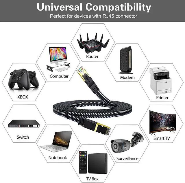 Wide Compatibility: With the RJ45 Connector, HiiPeak Gigabit Cat 8 Ethernet cable works perfectly with networking switch, routers, modem, PS3, PS4, PS5 X-box, networking printers, laptop, computers, coupler, smart TV and other devices with RJ45 connectors. It can also be fully backward compatible with Cat7, Cat6e, Cat6, Cat5e, Cat5. Only over 15 FT length Cat 8 nylon Ethernet cables come with Nail Clips.