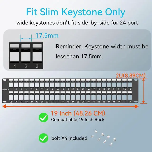 Fit Slim Keystone Only: 48 port patch panel cat6 is designed for high density jack which should be less than 17.5 mm 0.69 inch in width. Remind that 1u patch panel spacing requires slim keystones and standard or wider keystones do not fit side by side at this density.