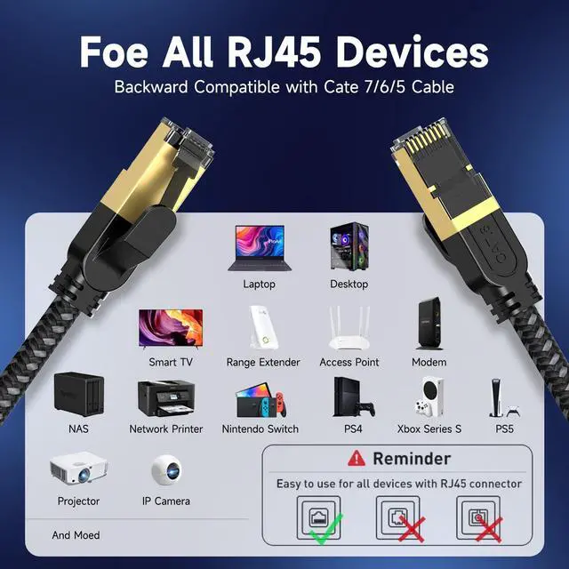 Classic RJ45 Connectors& Wide Compatibility: RJ45 Cable with two shielded RJ45 connectors at both ends, the Cat8 Ethernet cable works perfectly with networking switch, IP Cam, routers,, ADSL, Adapters, Modem, PS3, PS4, PS5, X-box, Patch panel, Servers, Networking Printers, NAS, VoIP phones, laptop, Coupler, Hubs, Keystone jack, Smart TV, Imac and other device with RJ45 connectors. Also compatible with Cat7/Cat5/Cat5e/Cat6/Cat6e.
