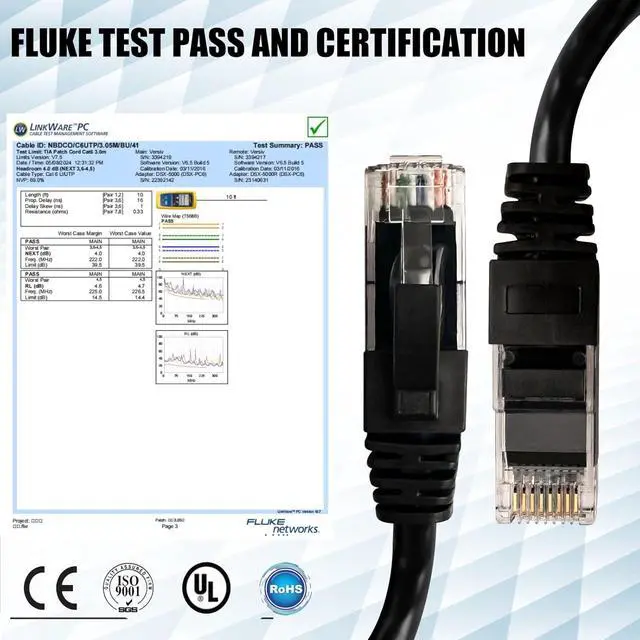 FLUKE TEST PASS and CERTIFICATION-Each Cat 6 internet cable 100% guarantee FLUKE testing passed and accompanying test reports, ensuring adherence to industry standards and specifications, guaranteeing the quality and reliability of the ethernet cables. ANSI/TIA- 568.2 -D compliant, REACH, UL listed, CE and RoHS compliant, ISO9001.