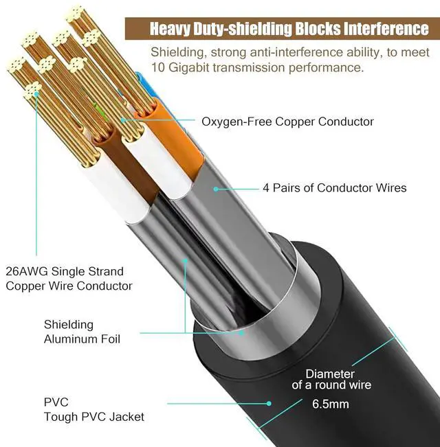 Superior Performance & 26AWG: Cat8 lan cable is made of 4 shielded foiled twisted pair(F/FTP) And 26AWG single-strand OFC wire, Each twisted pair is individually shielded with aluminum foil. It provides better protection from crosstalk, noise, and interference that can degrade the signal quality. Comparing with other 32AWG Ethernet cable, 26AWG Cat8 is thicker, a lot faster and stable in data transferring, which is perfectly suitable for AI smart products.