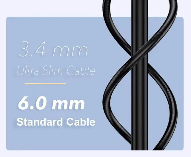 The OD cable is 3.6 mm- 3.68 mm thick, and the ergonomic design is better than traditional round slim cables. This slim ethernet cable rolls up easily for easy storage, takes up less space and slides easily under a carpet or port sill, or behind a piece of furniture.