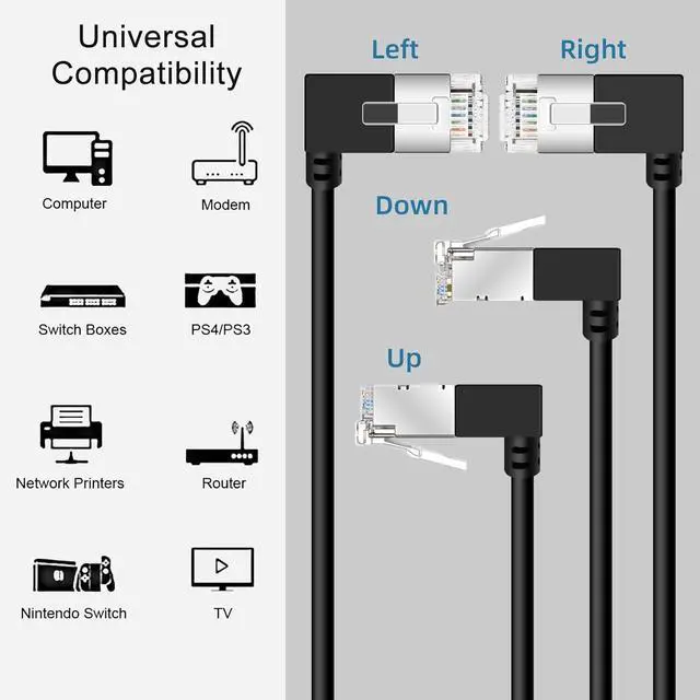 Left Angled: Dutevolns Cat6a 90° Left angled cable can be better used in compact and narrow spaces, tightly fitting your laptop or connecting to network wall panels behind furniture, effectively preventing cable bending and extending service life.