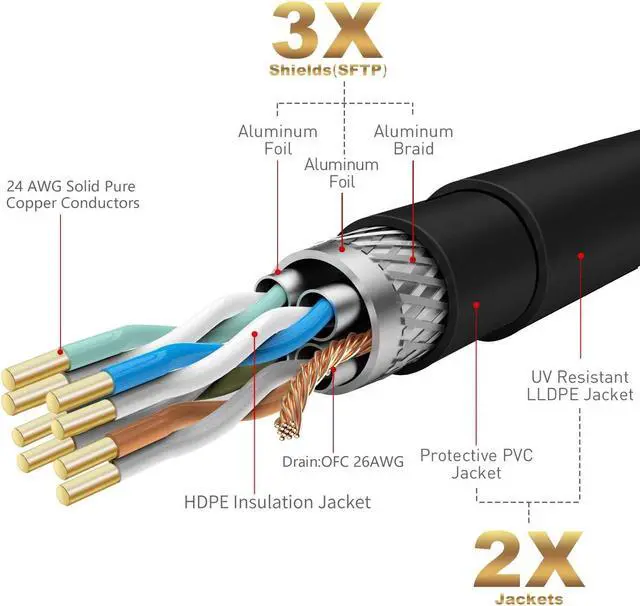 Triple Shielded SFTP & Gold-Plated ConnectorsMade of 4 Pairs of 24 AWG Solid OFC pure copper wires with two Gold-Plated RJ45 connectors on each end. - Each Twisted Pair is shielded with Double Aluminum Mylar Foil +64 Aluminum Braid Shield. 50 Micron Gold-plated Contact Pins in each connector. Anti-corrosive/corrosion/Oxidant, temperature tolerance range (-40 - 212)more durable and provides better protection from crosstalk, noise, and interference that can degrade the signal quality.