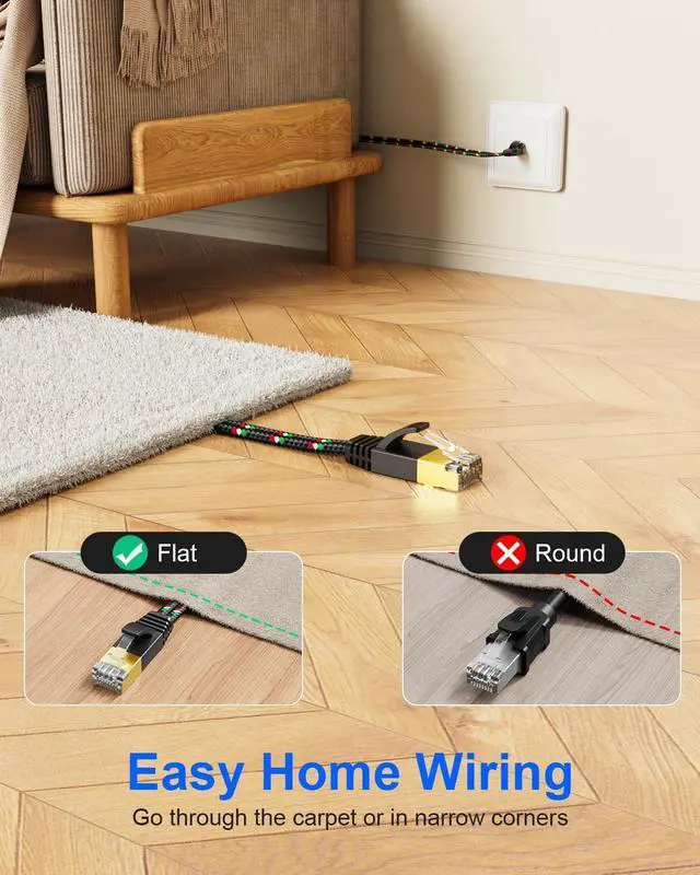 Flat Ethernet Cable DesignFlat Cat 7 Ethernet cable design helps avoid tangled cords and saves space. Flat Ethernet cable is super flexible when run under the carpet or bent in the plane of its thin cross-section such as doors, rotating arms, drawers etc