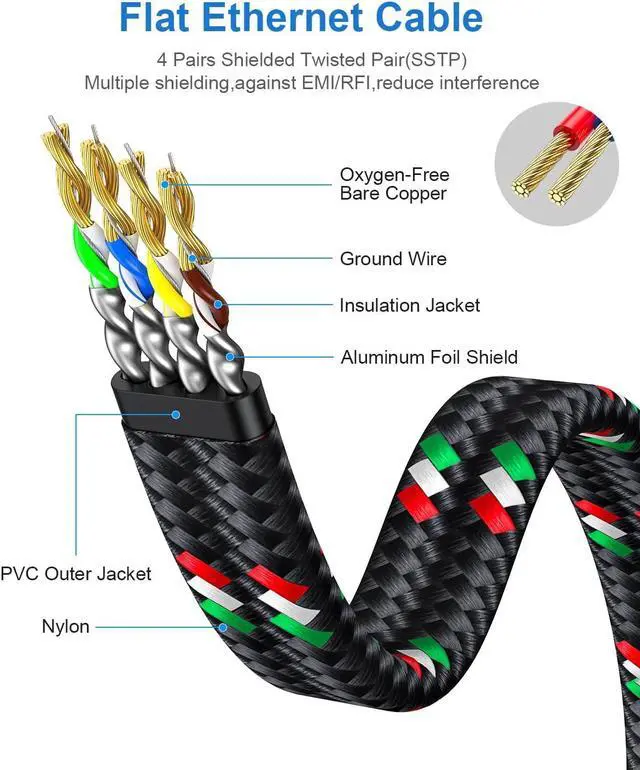 Gold Plated RJ45 Connectors: 32AWG OFC (Oxygen free copper) and 50 Micron gold plated RJ45 plugs make the transmission efficiency up to 100%, plus sheath material PVC and insulation material HDPE, we can enjoy faster and safe speed networking, Its anti-oxidation and anti-corrosion with long life performance