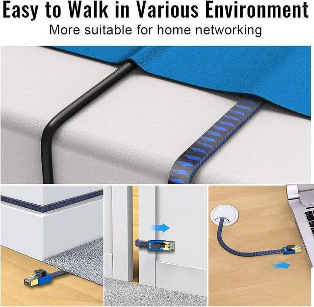 Space Saving Cat 8 Ethernet Cables Nylon Braided are in flat design to make it can run under the carpet rug and easier to line up against the wall. And Cat 8 Flat cables are super flexible that can be bent through corners or into desks. With this slim flat computer patch cable, you can save a lot of space on wiring them up along your house and office.
